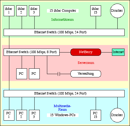 Einsatzzweck und Systemumgebung: Das Friedrich-Leopold- Woeste-Gymnasium verfügt über zwei voll ausgestatte EDV-Räume. Im modernen Informatikraum sind 15 Macintosh- Computer installiert, im Multimedia-Raum kommen 15 Windows-PCs zum Einsatz. Die Arbeitsplätze sind in beiden Fachräumen jeweils über einen Ethernet- Switch sternförmig vernetzt. In jedes Teilnetz ist ein Laserdrucker eingebunden. Den Datenaustausch im Netzwerk zwischen den insgesamt 30 Rechnern in den beiden Computerräumen organisiert die NetBerry, welche auch über einen T-DSL-Anschluß die Verbindung zum Internet herstellt. Diese NetBerry steht räumlich getrennt in einem kleinen Nebenraum, in dem zusätzlich zwei weitere ebenfalls an das Netzwerk angeschlossene Lehrerarbeitsplätze untergebracht sind. |